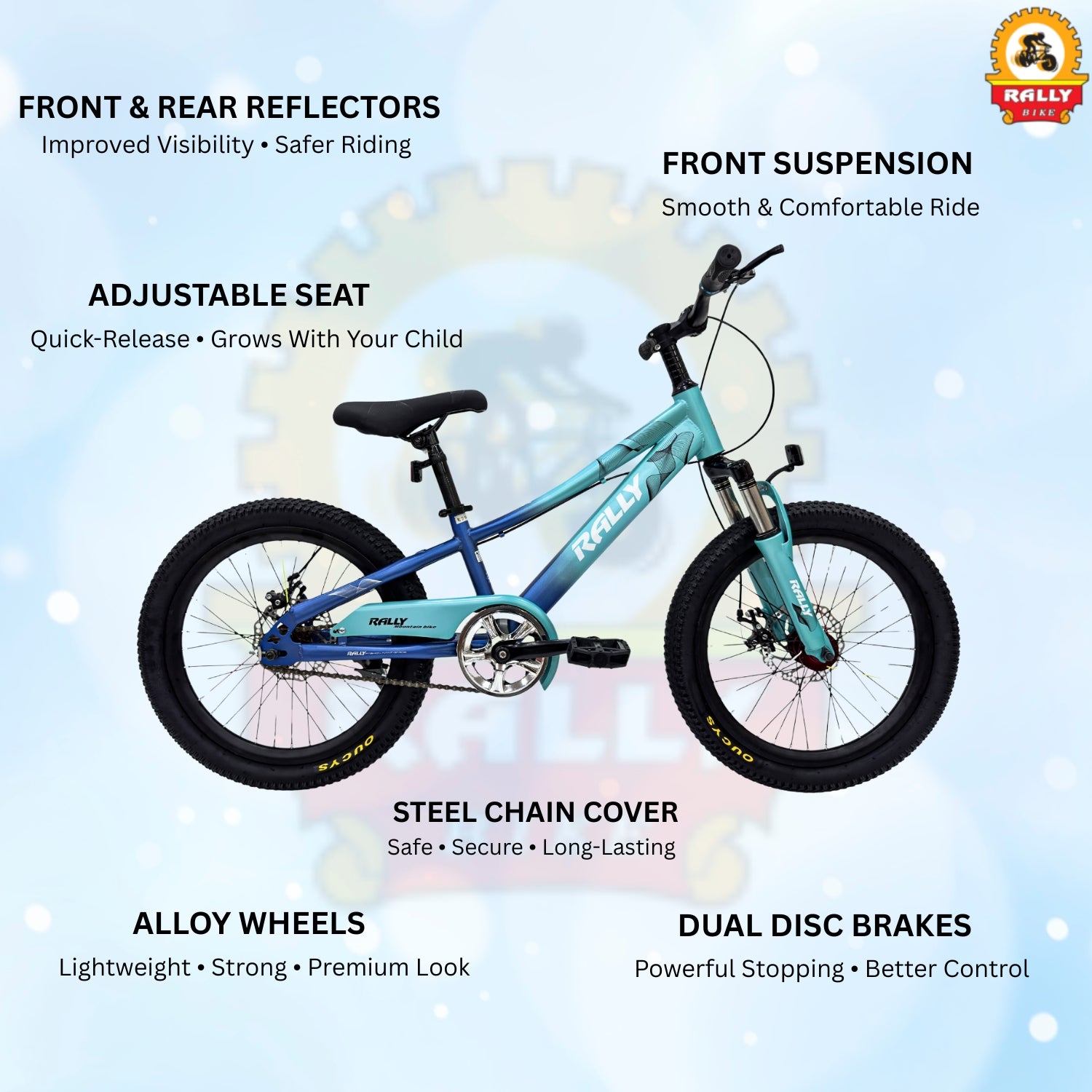 The Rally RL-20-1140-1SUS Kids Bicycle is built for safety, comfort, and style. With a 20-inch wheel size, this bike is perfect for young riders wanting stability and performance. It features front suspension, strong alloy wheels, and dual disc brakes to ensure total control on the road or trail. The adjustable quick-release seat allows the bike to grow with your child, while the two-tone sporty design gives a modern and attractive look. Safety is a priority—this model includes front and rear reflectors and a steel chain cover. Ideal for daily rides, outdoor play, and developing confidence in young cyclists.
